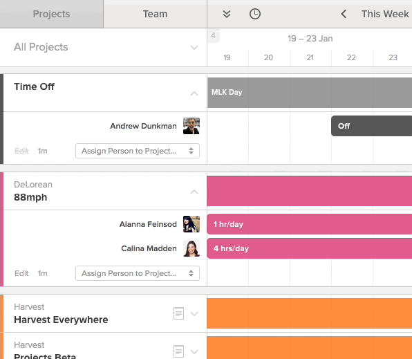 Simply select “Everyone” from the “Assign Person to Project…” option on the Time Off project and assign the days as you normally would. As always, you can use the Notes field to explain what the Time Off is for. And this company-wide assignment behaves like any other Time Off assignment, showing up in all project rows to help you avoid scheduling projects on these days off.