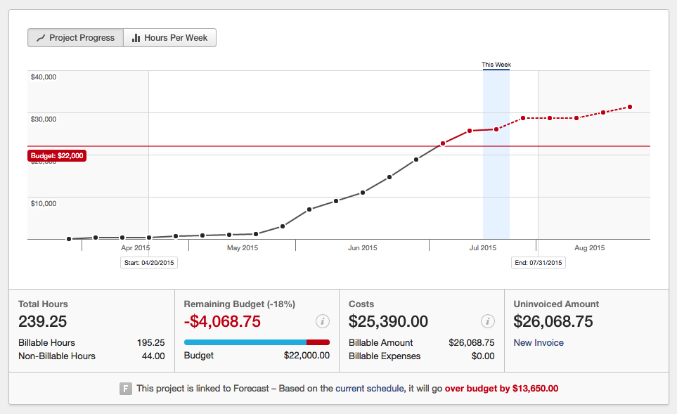 - Forecasted Budget Spent: If your project is linked to Forecast, we’ll use your billing rate to convert future scheduled hours in Forecast to a projection of budget spent. It’s even easier to see if you’ll exceed your budget with Forecast.