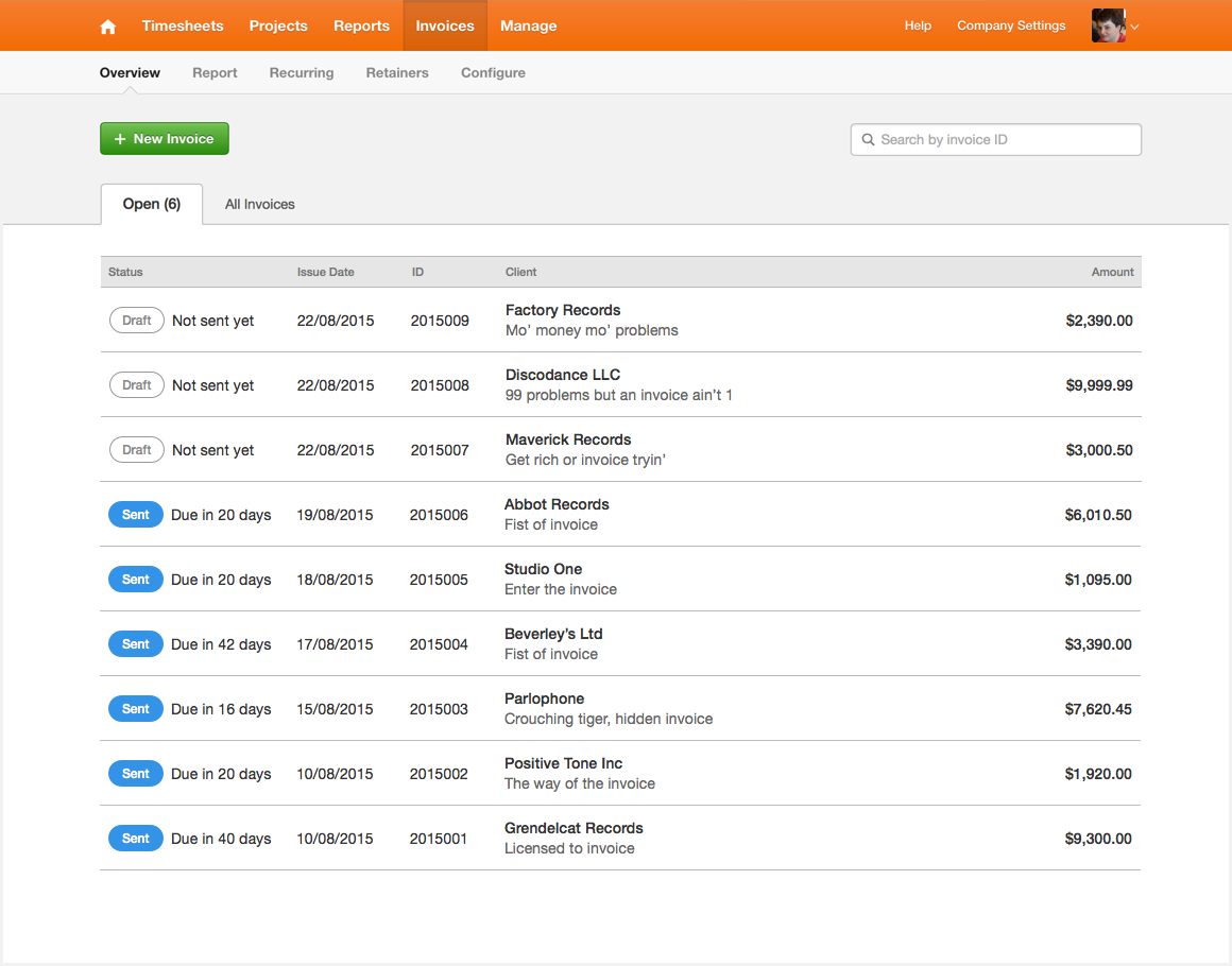 What’s that mean? Soon, when you head to Invoices > Overview, you’ll see a new design, as well as a few new handy features. Other sections in the Invoices tab—like Report, Recurring, and Retainers—will stay the same. And never fear: all of your existing data will remain safe and sound.