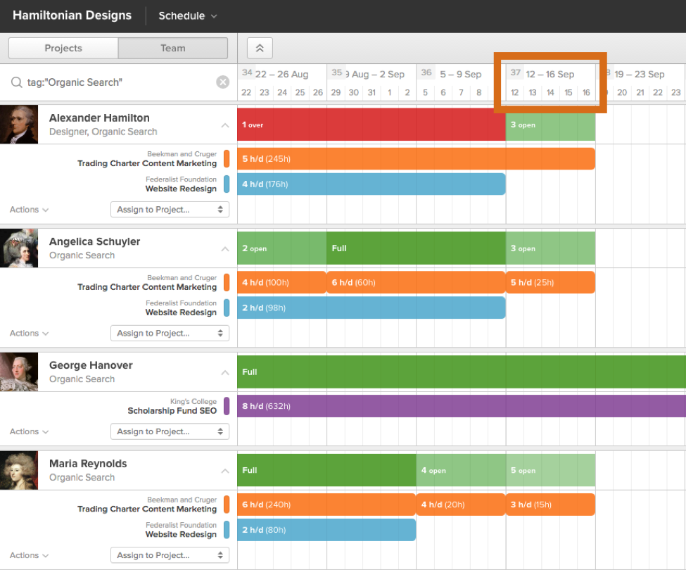 Accurate team scheduling also allows you to get a rough idea of how much revenue your business can expect to bring in over the next few months. This can help focus your sales efforts, letting you know if you just need to land a few small projects or a white whale. You can get a sense of when to ramp up sales and marketing efforts or launch a major new campaign. And if you have more work than your team can handle, it might be time to expand your staff!