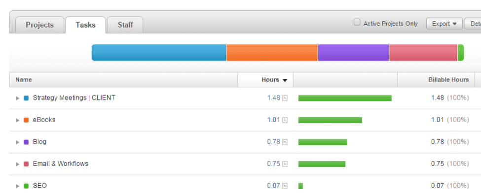 Make sure you track how much time your products and services take. This will let you figure out exactly how much it costs your agency to produce an e-book or conduct an audit, for example. Then you can price your services based on how much they actually cost your business. Harvest users find this graph by going to Reports > Time.